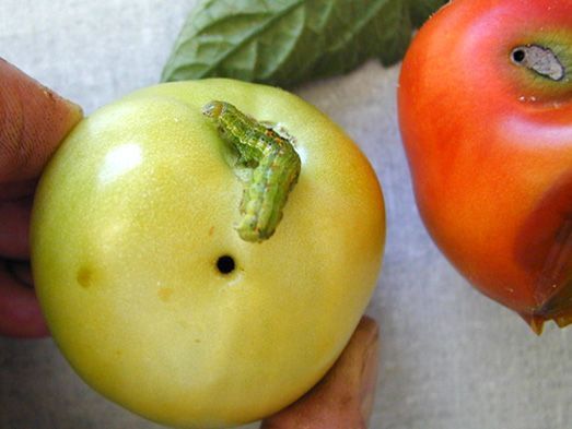 इंडोक्साकार्ब 14.5 SC (1.0 मिली/ली) या थियोडिकार्ब 75WP (1.0 ग्राम/ली) या इनामेक्टिन बेंजोएट 5% SG (0.4 ग्राम/ली) या केंद्रीय कीटनाशक बोर्ड (CIB) के पास टमाटर फल छेदक के लिए पंजीकृत किसी अन्य प्रभावी कीटनाशक, वानस्पतिक या जैव-कीटनाशक का छिड़काव करें।